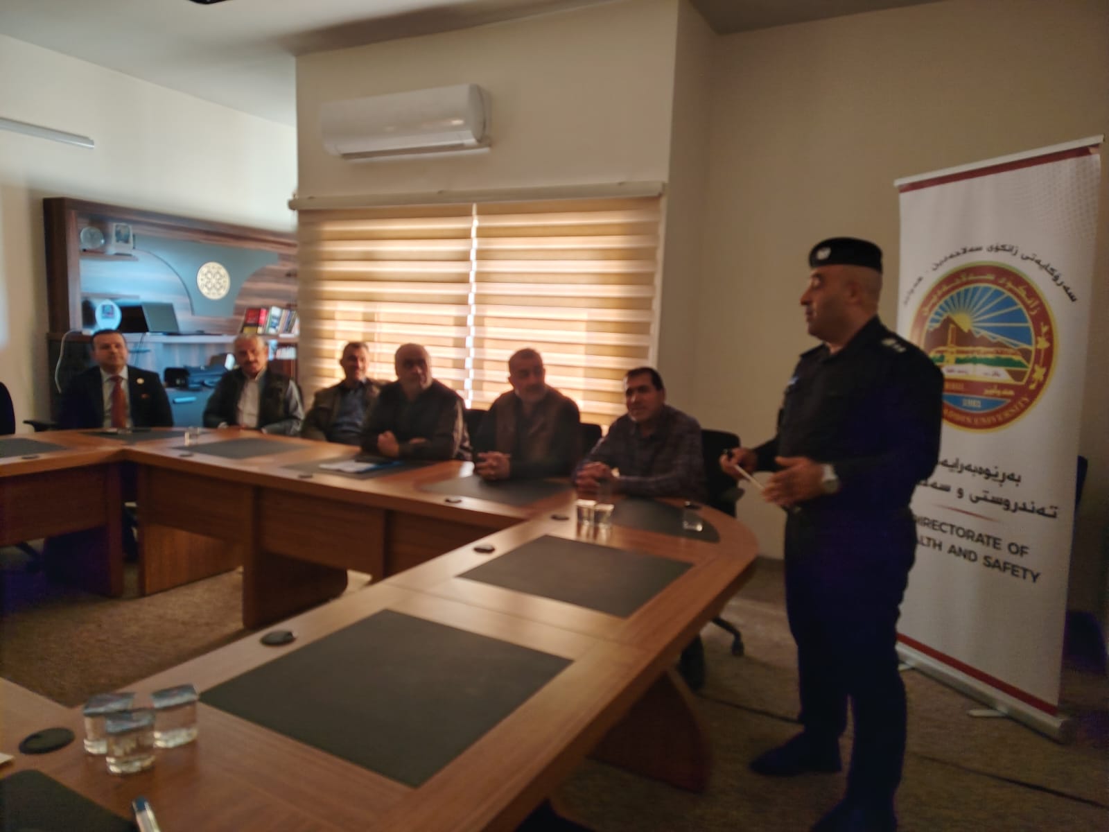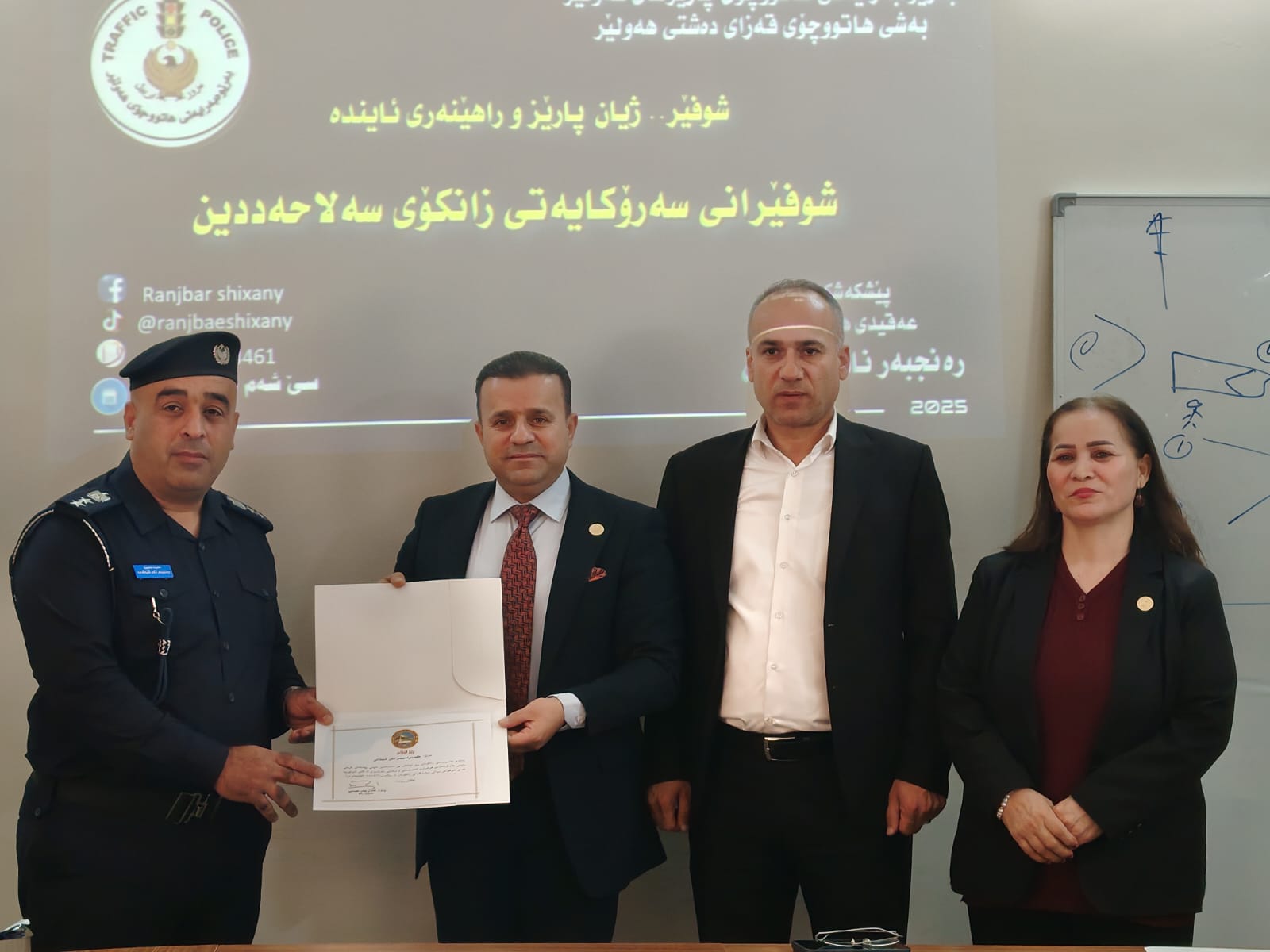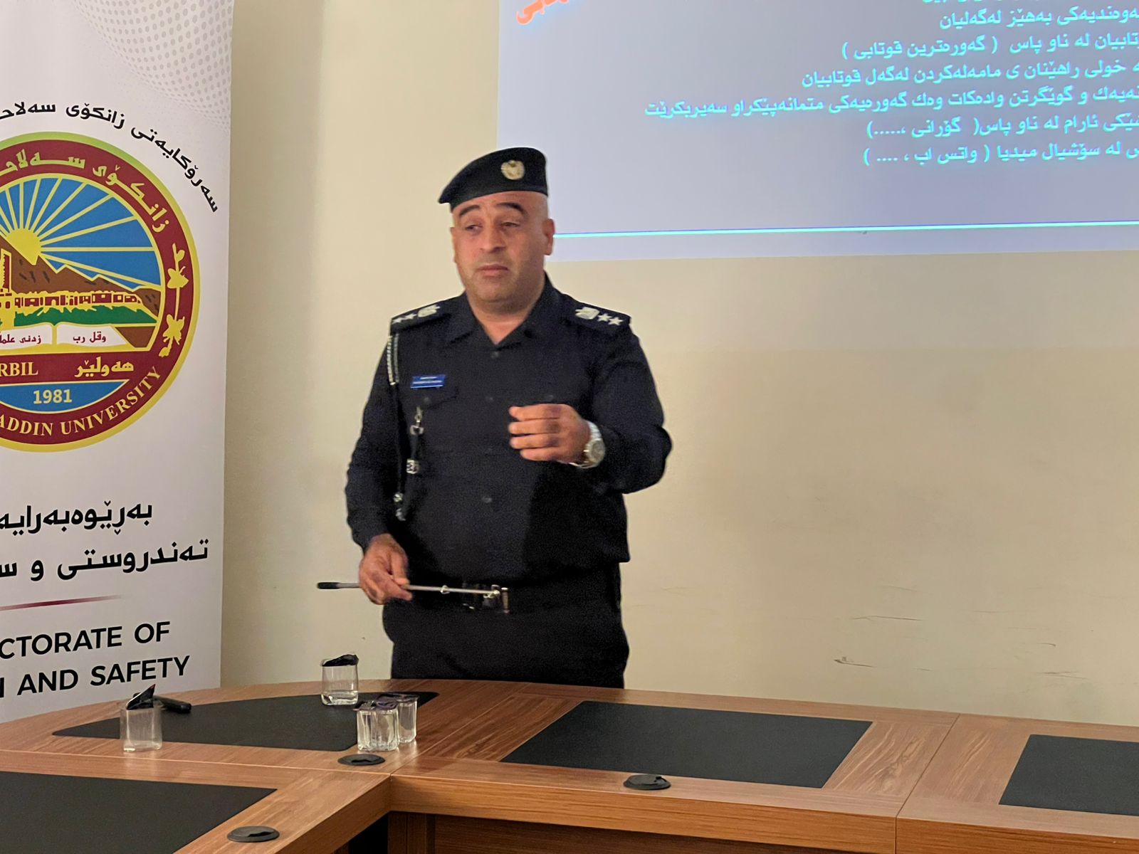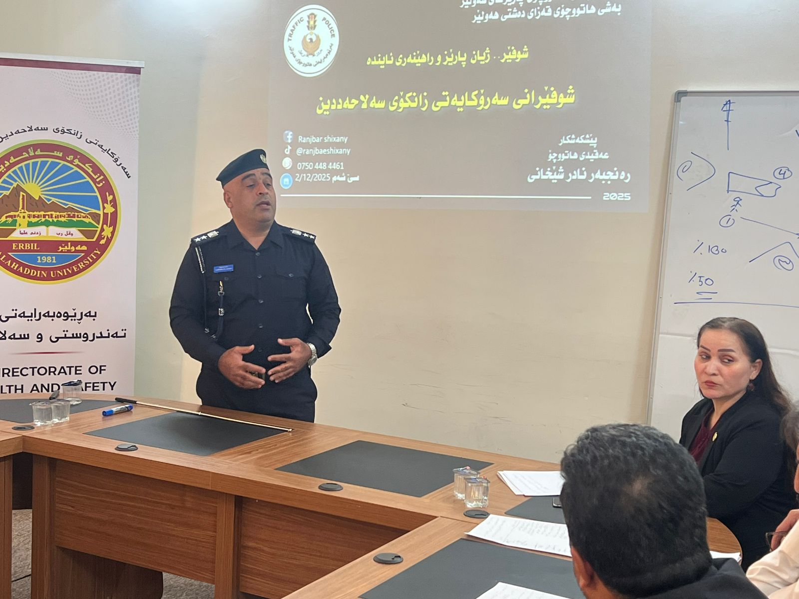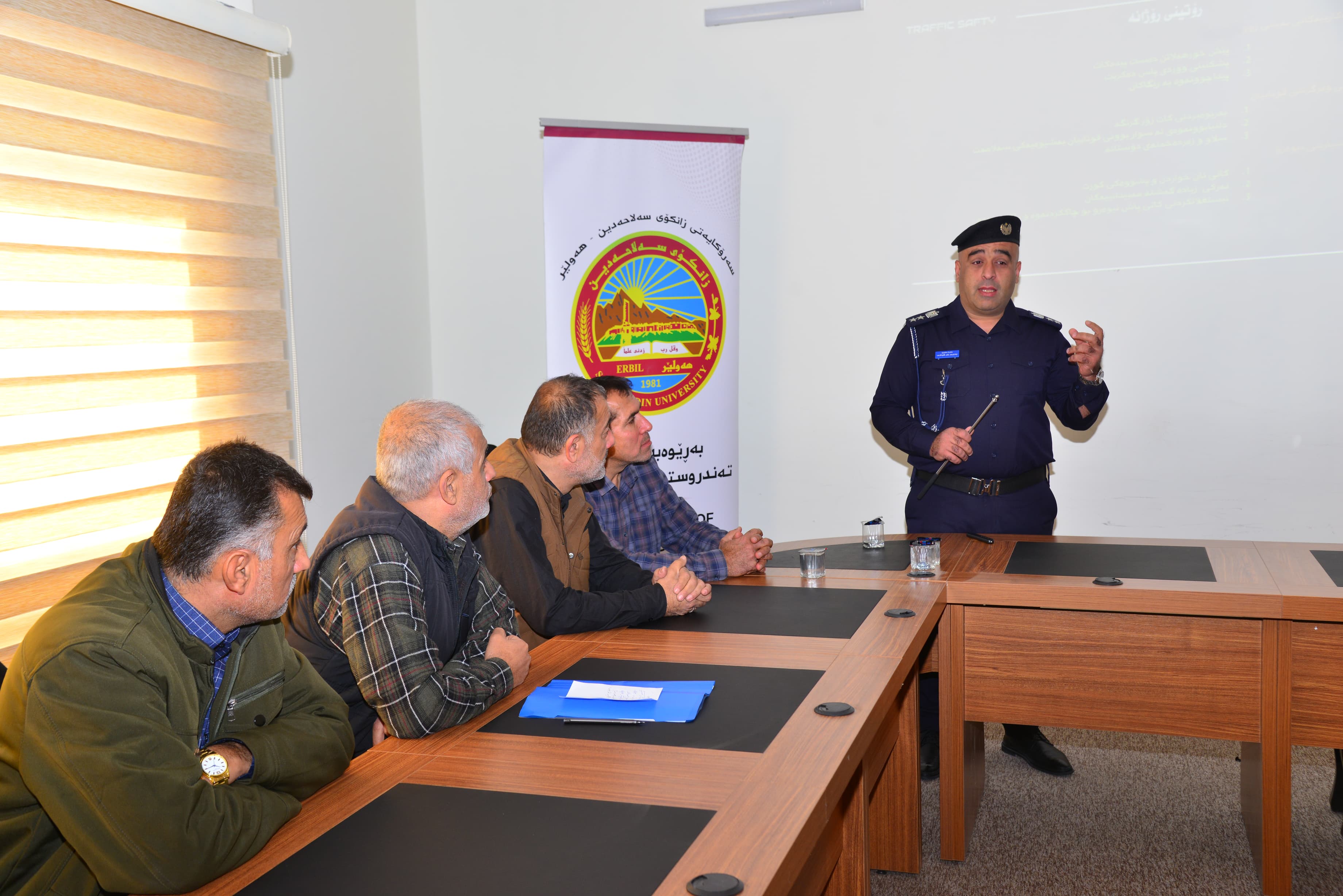 بەڕێوەبەڕایەتی تەندروستیی و سەلامەتی بەهەماهەنگی بەڕێوبەرایەتی هاتووچۆی دەشتی هەولێر و بەئامادەبوونی یاریدەدەری سەرۆکی زانکۆ بۆ کارگێری و دارایی بەڕێز (د.حسێن سعدی ابراهیم ) وە بەڕێوەبەری کارگێری زانکۆمان بەڕێز(هندرێن طاهر حاجی) بەڕێوەبەری تەندروستی و سەلامەتی بەڕێز(ئاریان حسێن دزەیی) هەڵسا بە بەڕێوەچوونی وۆرك شۆپێک لەپێناو بڵاوکردنەوەی هۆشیاری تەندروستی و پاراستنی تاک و جێ بەجێ كردنی ڕێنماییەکانی هاتووچۆ بۆ خۆپارێزی تاک و سەلامەتی گواستنەوەی مامۆستایان و فەرمانبەران و قوتابیان وە نەشڵەژان و خۆ بەدوورگرتن لەهەڵچوون لەکاتی شوفێری دا كەلەلایەن بەڕێز” عقید رەنجبەر شیخانی”کۆمەڵێک زانیاری بە سوود پێشکەش کرا و کۆمەڵیک پرس ئاڵوگۆڕ کران و پاشان ڕێزلێنان پێشکەش بە عەقیدی ڕاهێنەر کرا