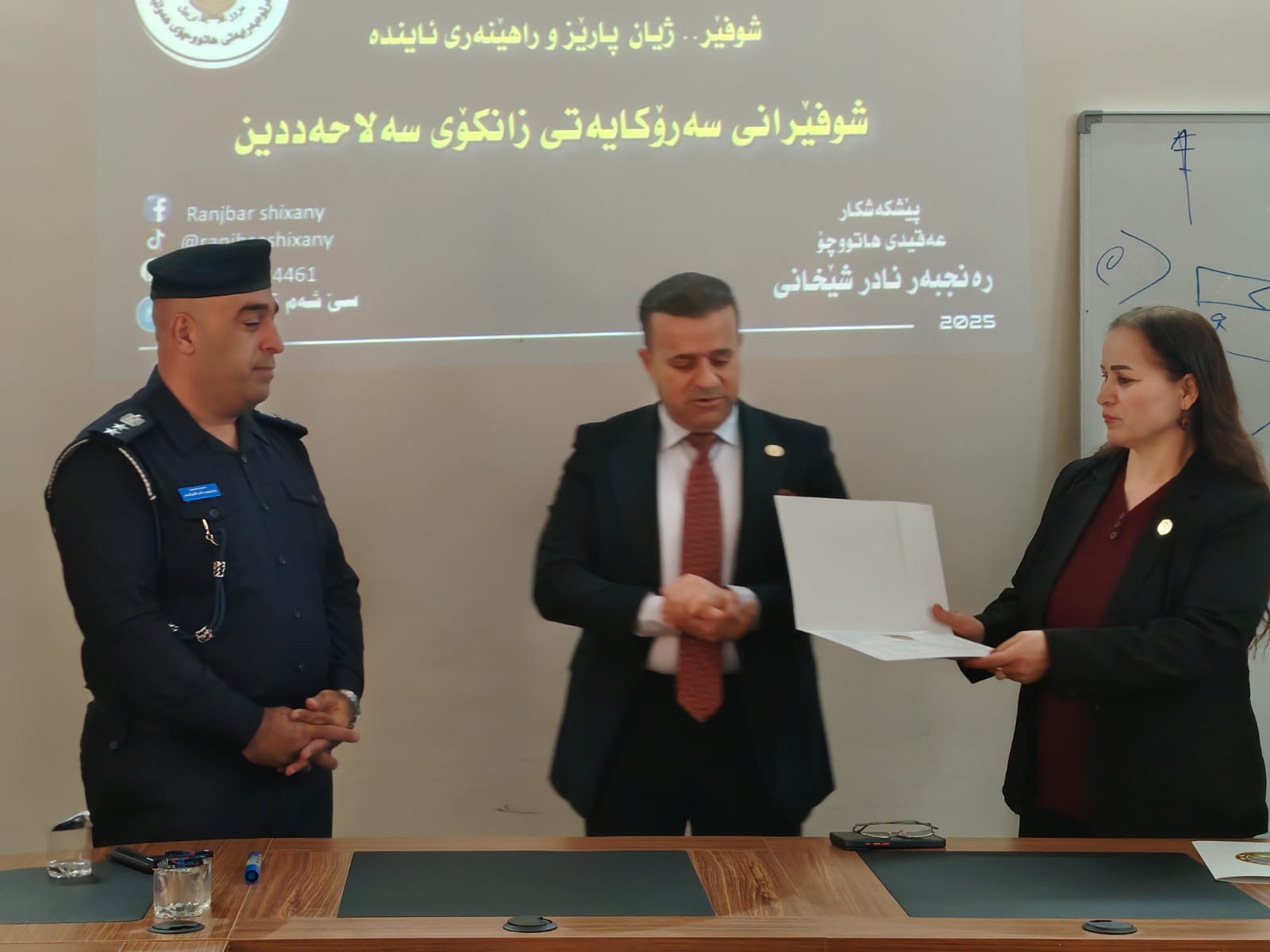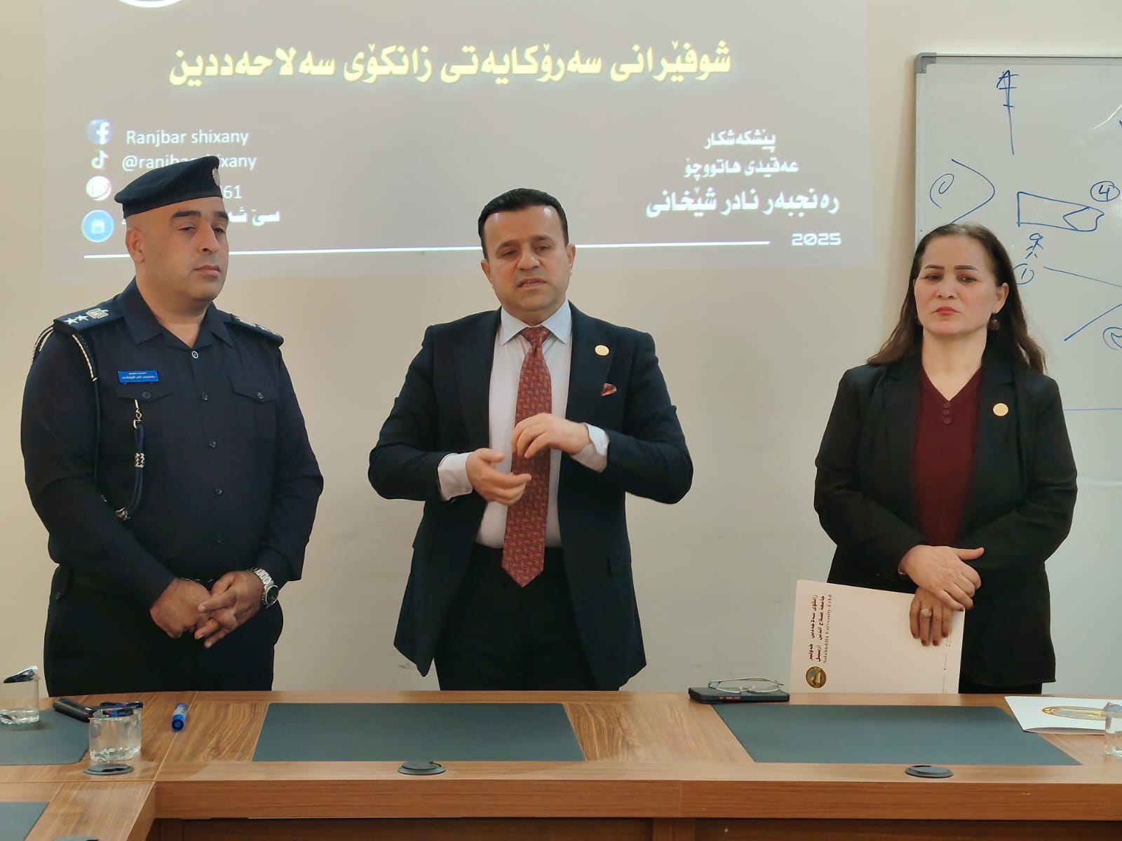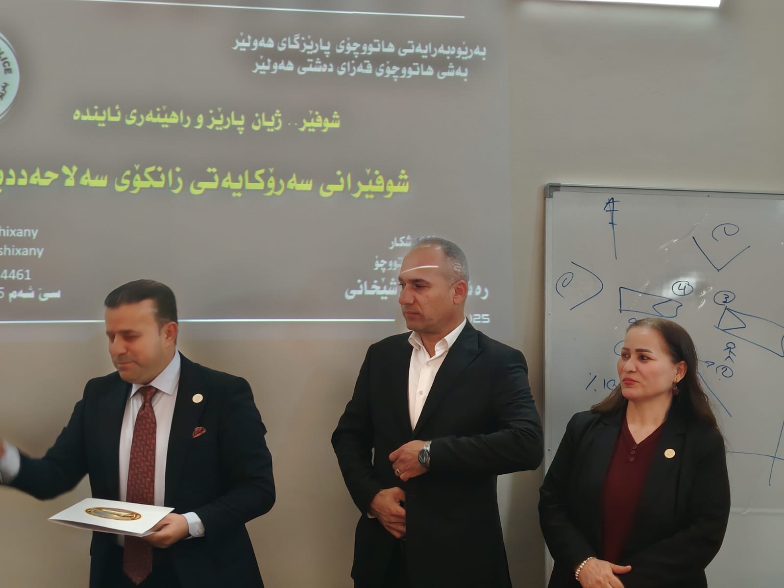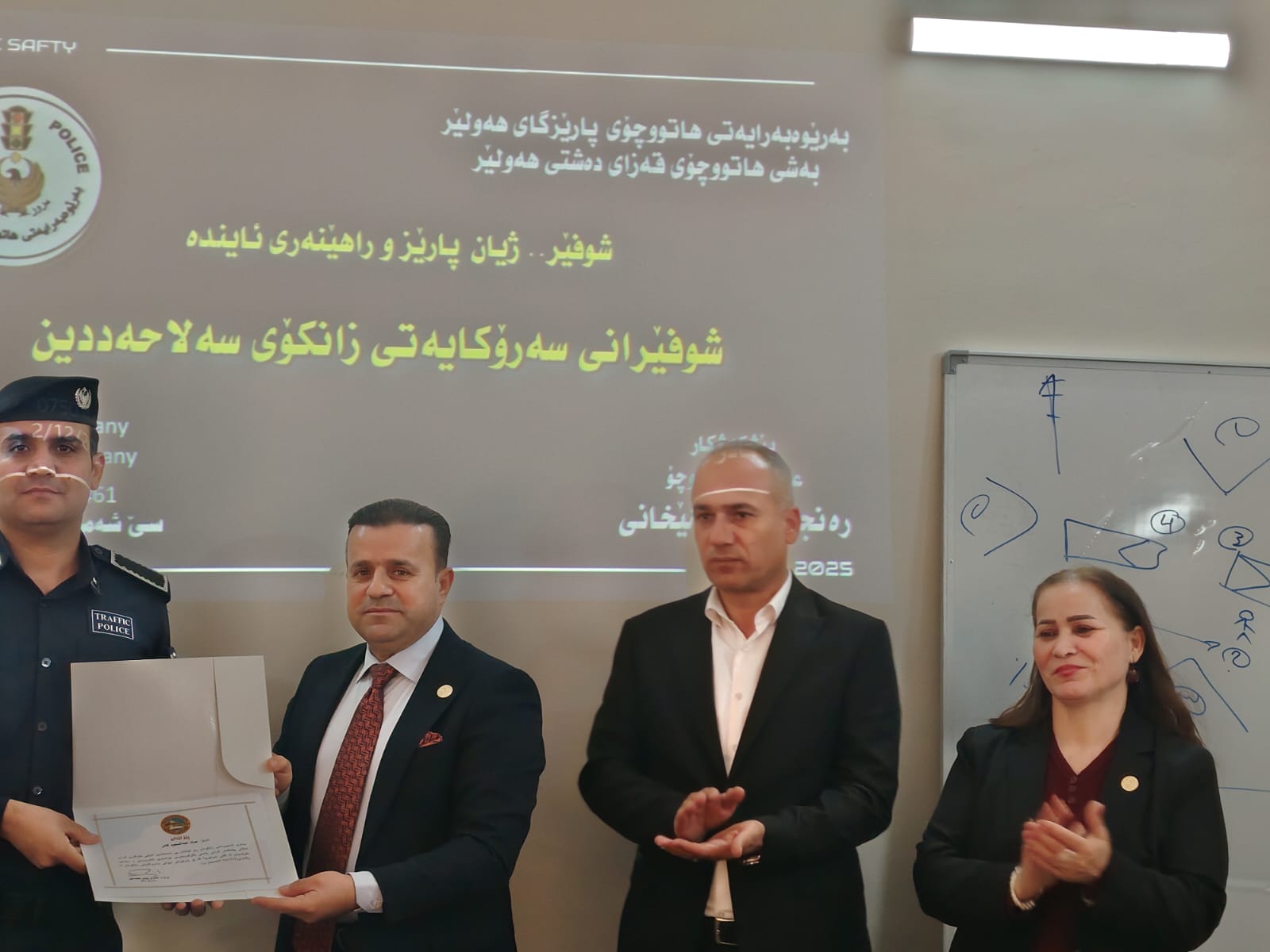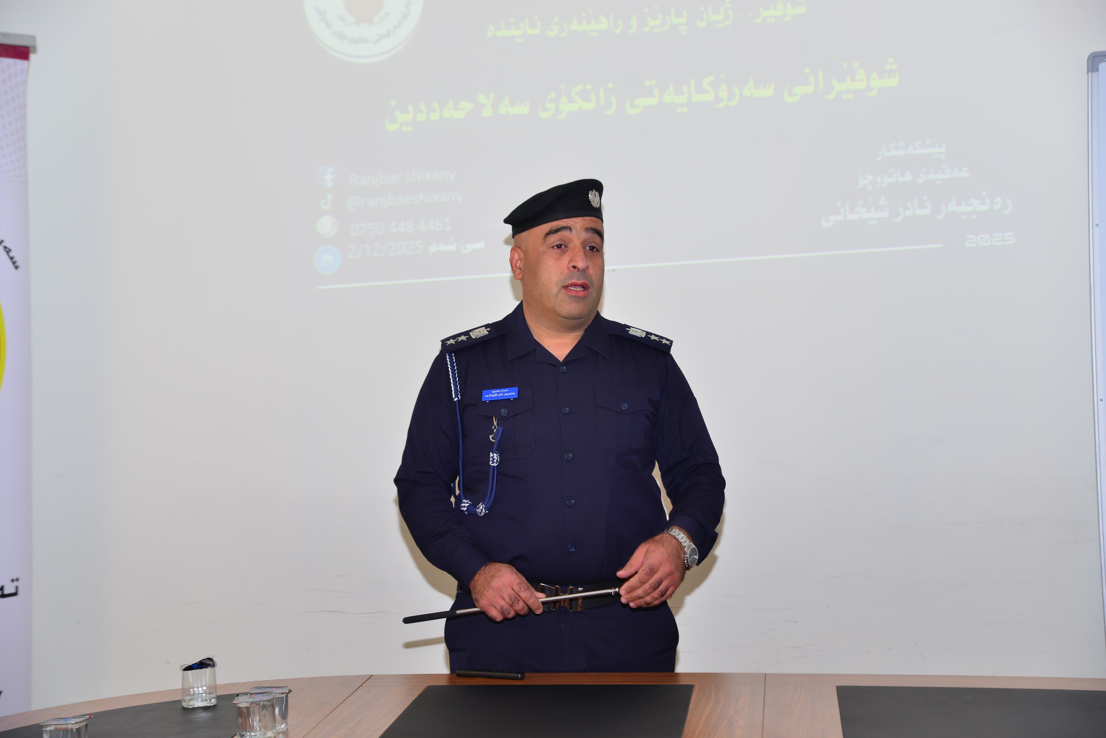 بەڕێوەبەڕایەتی تەندروستیی و سەلامەتی بەهەماهەنگی بەڕێوبەرایەتی هاتووچۆی دەشتی هەولێر و بەئامادەبوونی یاریدەدەری سەرۆکی زانکۆ بۆ کارگێری و دارایی بەڕێز (د.حسێن سعدی ابراهیم ) وە بەڕێوەبەری کارگێری زانکۆمان بەڕێز(هندرێن طاهر حاجی) بەڕێوەبەری تەندروستی و سەلامەتی بەڕێز(ئاریان حسێن دزەیی) هەڵسا بە بەڕێوەچوونی وۆرك شۆپێک لەپێناو بڵاوکردنەوەی هۆشیاری تەندروستی و پاراستنی تاک و جێ بەجێ كردنی ڕێنماییەکانی هاتووچۆ بۆ خۆپارێزی تاک و سەلامەتی گواستنەوەی مامۆستایان و فەرمانبەران و قوتابیان وە نەشڵەژان و خۆ بەدوورگرتن لەهەڵچوون لەکاتی شوفێری دا كەلەلایەن بەڕێز” عقید رەنجبەر شیخانی”کۆمەڵێک زانیاری بە سوود پێشکەش کرا و کۆمەڵیک پرس ئاڵوگۆڕ کران و پاشان ڕێزلێنان پێشکەش بە عەقیدی ڕاهێنەر کرا