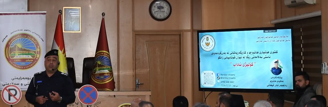 لە درێژەی کارو چالاکییەکانی بەرێوبەرایەتی تەندروستی و سەلامەتی سەرۆکایەتی زانکۆمان (م. ئاریان حسین دزەیی) و بە هەماهەنگی لەگەڵ هۆبەی تەندروستی و سەلامەتی کۆلێژى ئاداب ڕۆژى سێ شەممە رێکەوتی ١٠-٢-٢٠٢٦ کاتژمێر (١٠:٣٠) ی بەیانی لە هۆلی (فەرهادی) وۆرکشۆپێک بۆ عقیدی هاتووچۆ (رەنجبەر نادر شێخانی) بەناونیشانى (کلتورى هۆشیارى هاتووچۆ و کاریگەریەکانى لە بەرزکردنەوەى ئاستى سەلامەتى رێگا لە نێوان قوتابیانى زانکۆ) سازکرا. لەو ۆرکشۆپەکەدا بەرێزیان باسى لە کلتورى هۆشیارى هاتووچۆى کرد لە پێناو سەلامەتى و پاراستنى خۆمان پیویستە پابەند بین بە یاساکانى هاتووچۆ, باسى لە چەند یاسایەکى هاتووچۆى کرد.