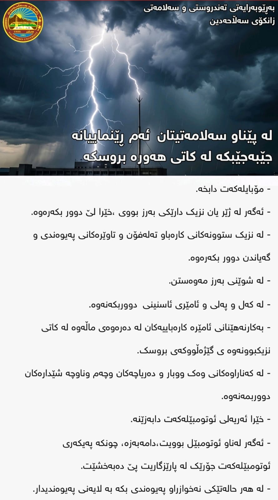 Monday, March 30, 2026 - 12:00 له پێناو سەلامەتیتان ئەم رێنماییانە جێ بەجێ کە بکە له کاتی هەورە بروسکە چۆن خۆت دەپارێزێیت؟ Gallery