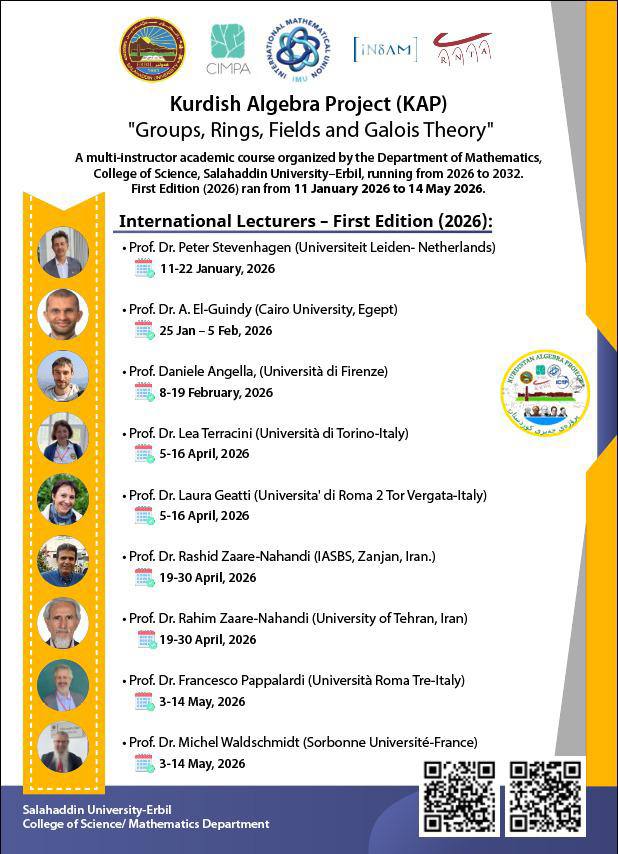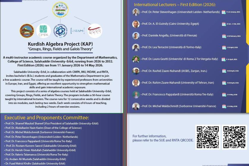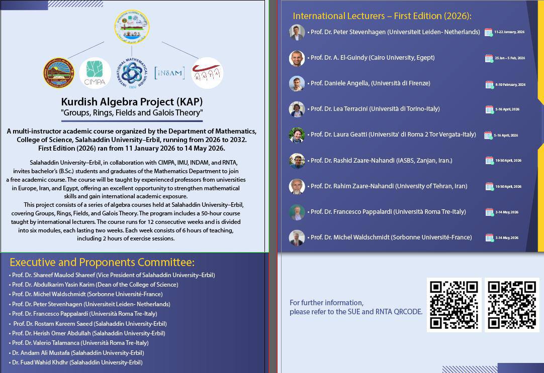 Under the supervision of the President of Salahaddin University–Erbil, the Department of Mathematics at the College of Science will host the opening ceremony of the “Kurdish Algebra Project” course in the department’s conference hall on 12 January 2026 at 10:00 a.m.