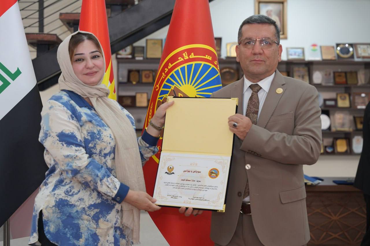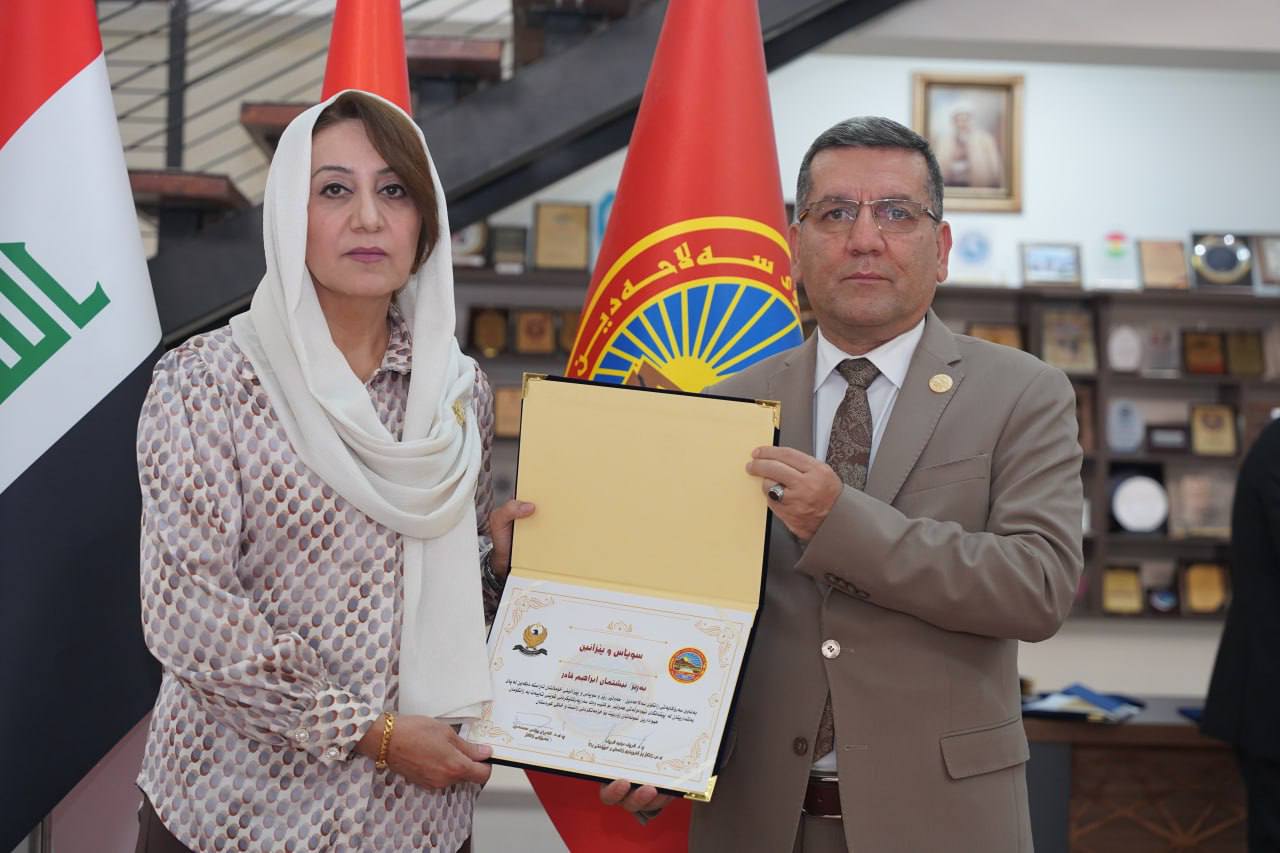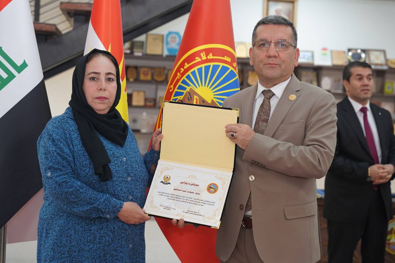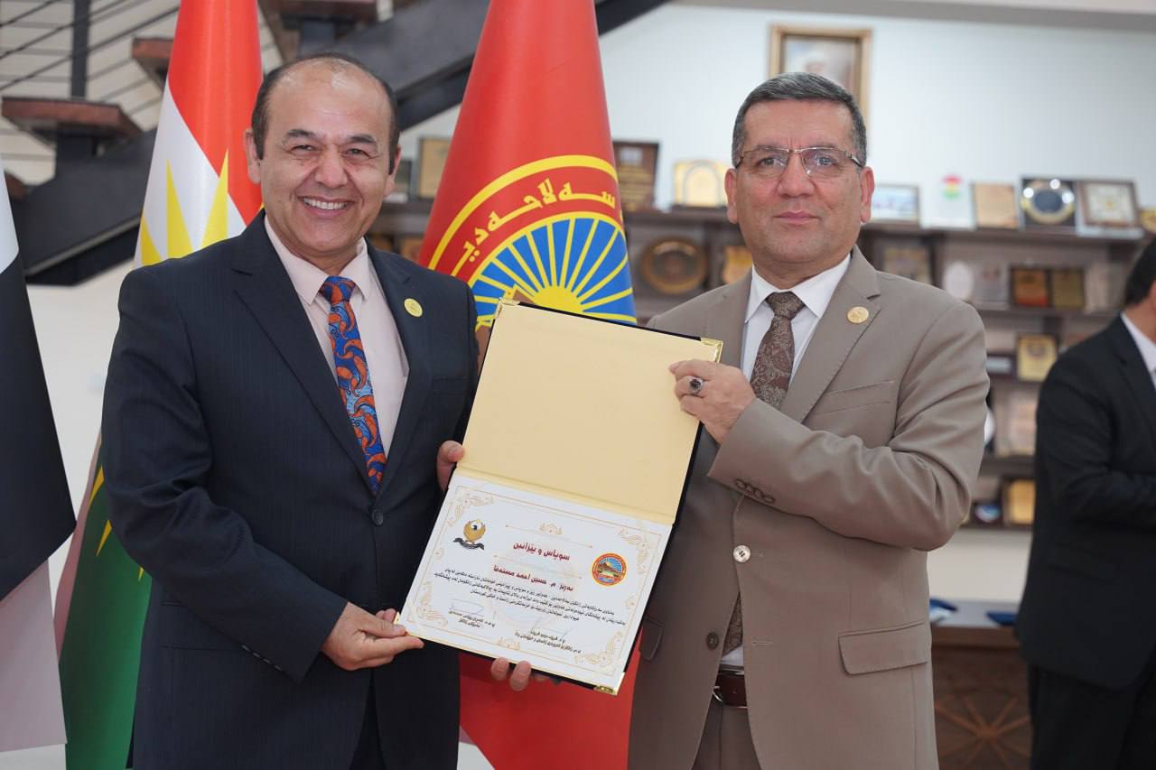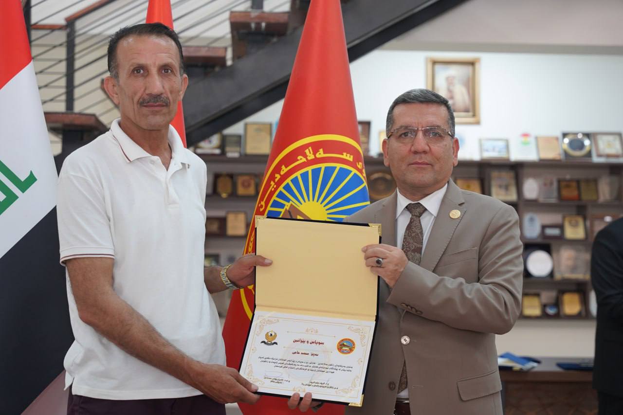 Today, 28 April 2025, Asst. Prof. Dr Kamaran Younis M. Amin, President of Salahaddin University-Erbil (SUE), accompanied by Prof. Dr Shareef Maulod Shareef, Vice-President for Scientific Affairs and Postgraduate Studies, along with a number of administrative officials, honoured and presented certificates of appreciation to the staff who participated in the International Book Fair.