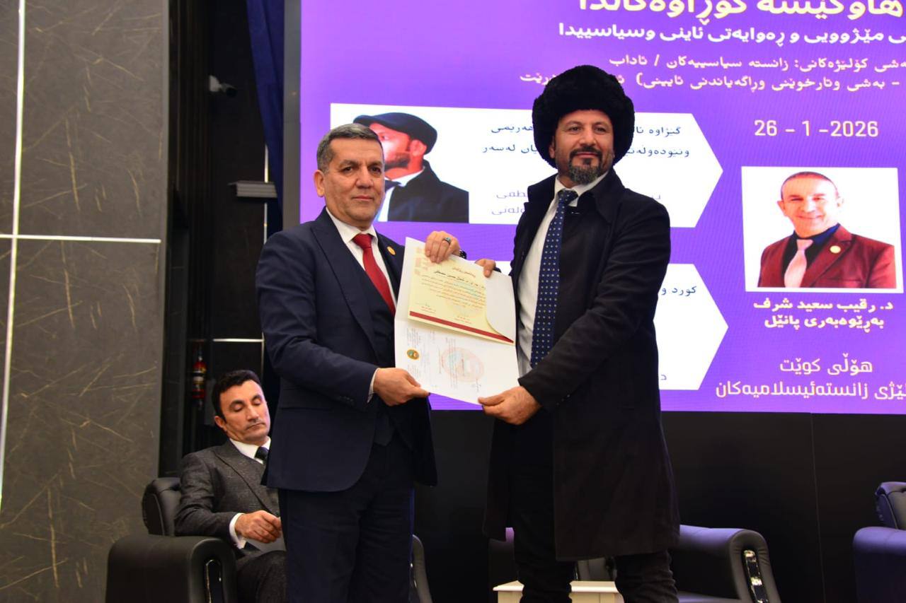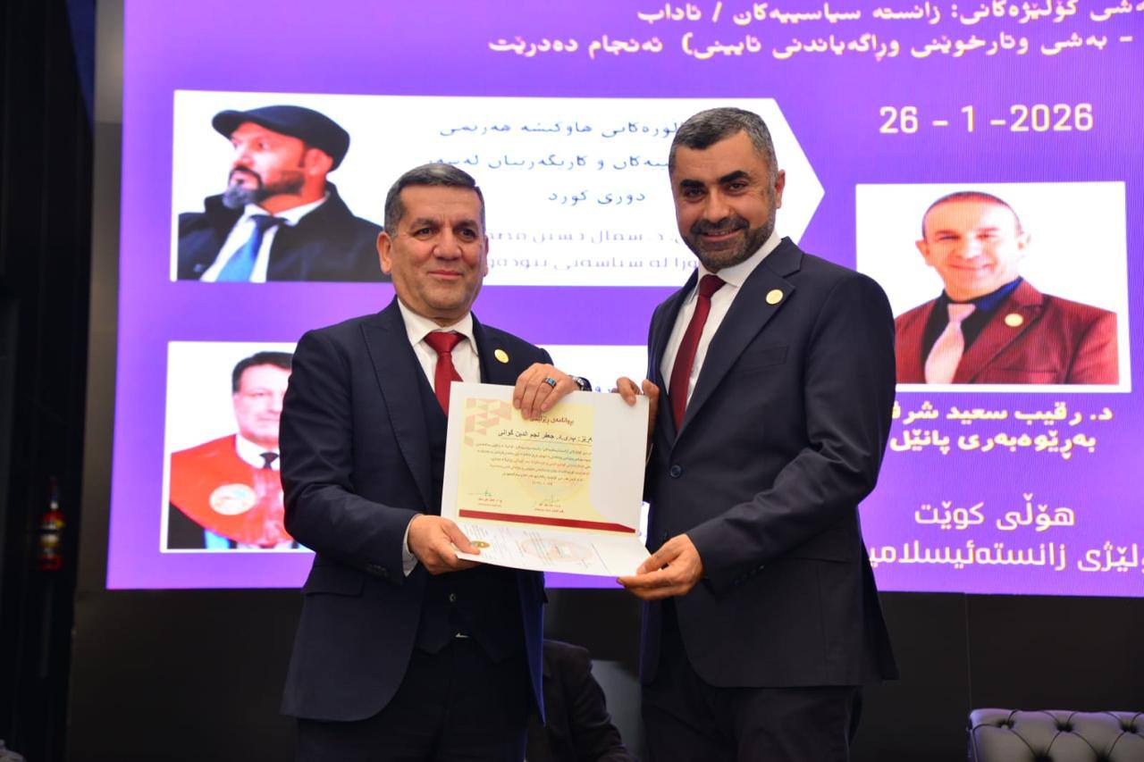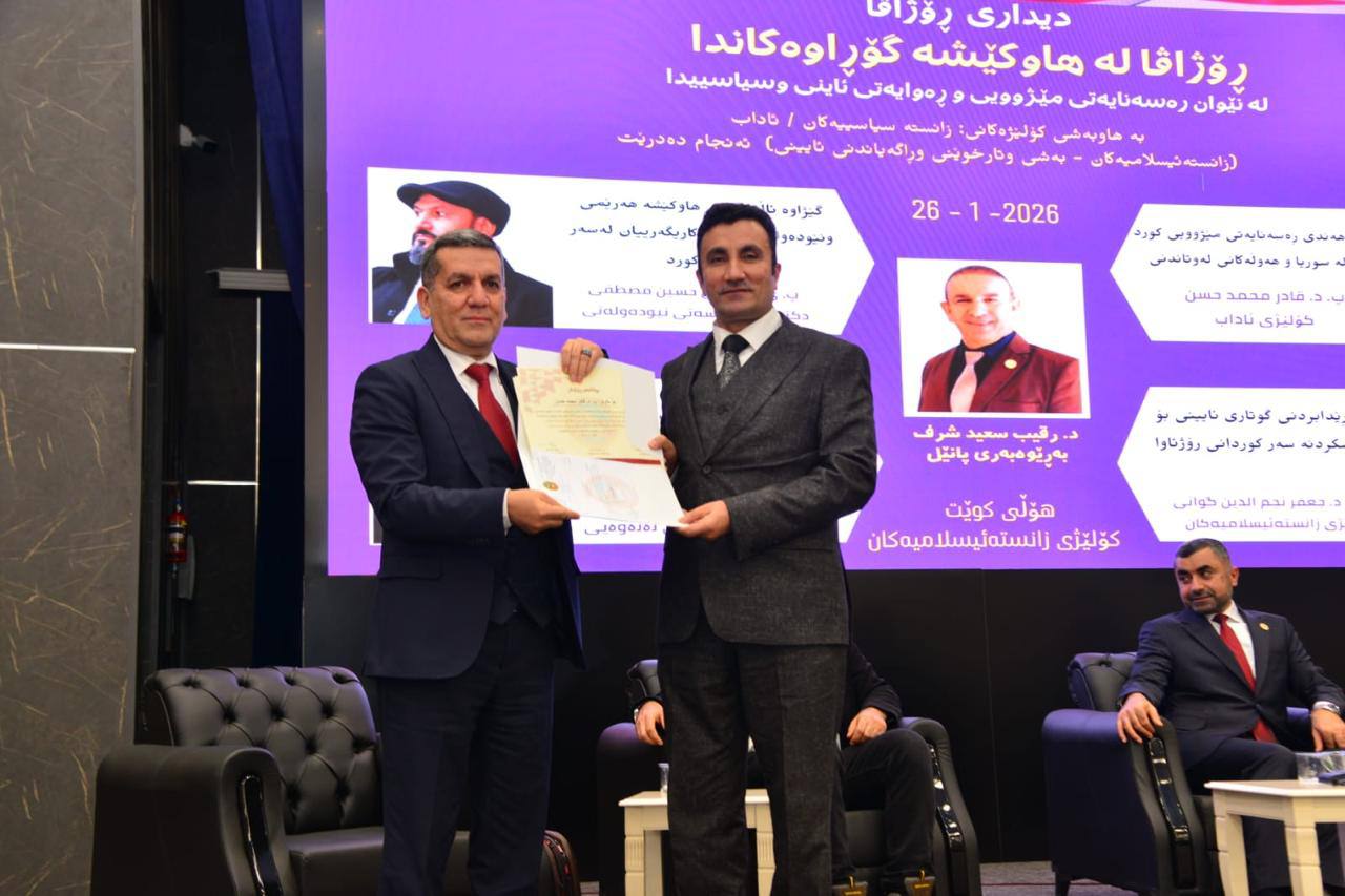 ئەمڕۆ ڕێککەوتی ٢٦ـی ١ـی ٢٠٢٦ بە ئامادەبوونی “ پ.د.کامەران یونس محمدئەمین” سەرۆکی زانکۆی سەلاحەدین و “ د.عەبدوڵلا سەعید وەیسی” سەرۆکی یەکێتی زانایانی ئایینی ئیسلامی کوردستان و “ و “ د.ئامانج برادۆستی” بەرپرسی ناوچەی زانکۆ و “ پ.د.جمیل علی “ ڕاگری کۆلێژی زانستە ئیسلامییەکان و “ پ.د.موسا محمد” ڕاگری کۆلێژی ئاداب و “ پ.ی.د هیوا مجید” ڕاگری کۆلێژی زانستە سیاسییەکان و سەرۆک بەش و مامۆستایان و قوتابییان دیداری ڕۆژاڤا لە هاوکێشە گۆڕاوەکاندا - لە نێوان ڕەسانەیەتی مێژوویی و ڕەوایەتی ئایینی و سیاسییدا بەڕێوەچوو