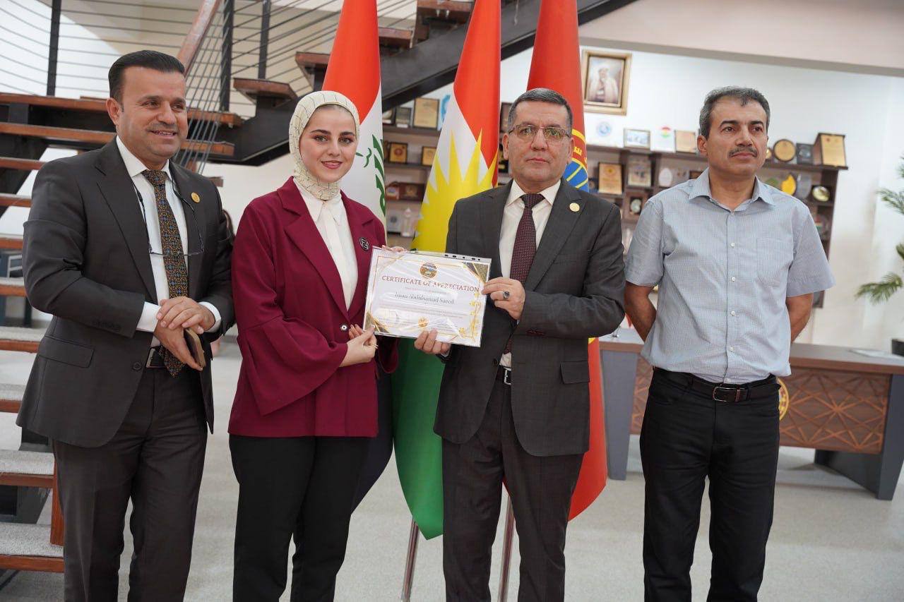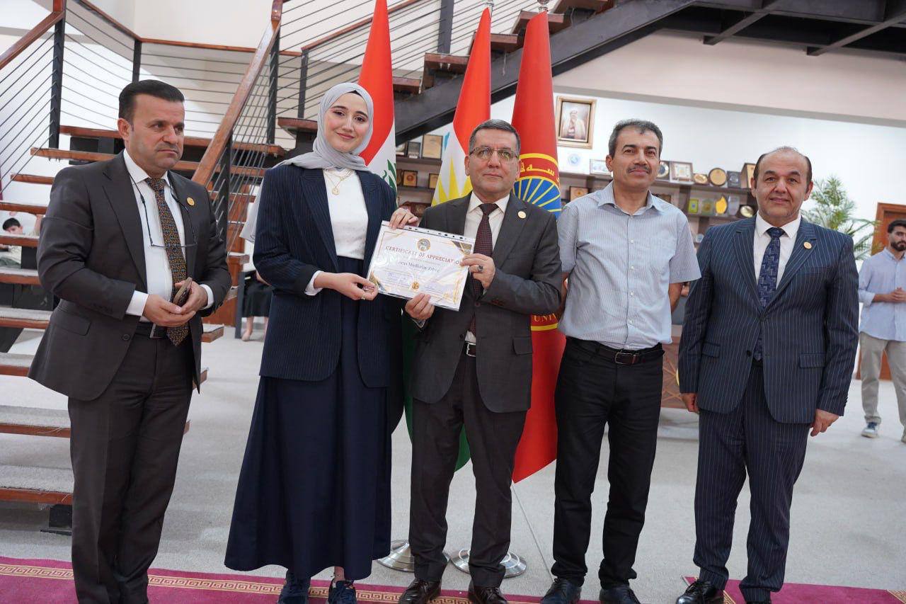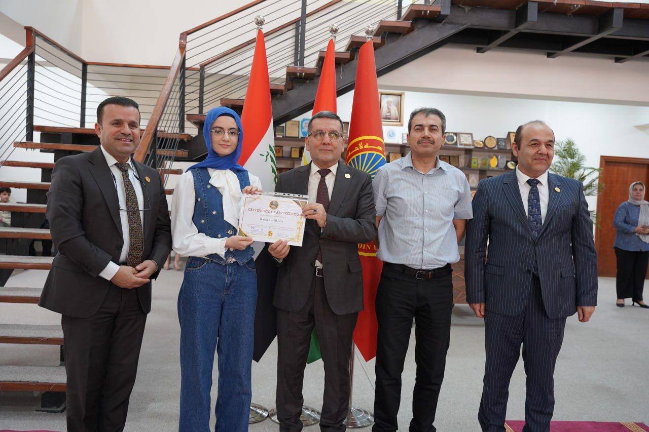 ئەمڕۆ رێككەوتی 5ی ئابی 2025 "پ.د. كامران یونس محمدامین" سەرۆكی زانكۆ، بە ئامادەبوونی "پ.د. حسین سعدی" یاریدەدەری سەرۆكی زانكۆ بۆ كاروباری كارگێڕی و دارایی و "م. حسین احمد مستەفا" بەرێوەبەری سەنتەری پەرەپێدانی كار و كارسازی، بڕوانامەی رێزلێنانی بەخشرایە مامۆستایان و قوتابییانی بەشدار لە پرۆگرامی ئاڵوگۆرى زانستى جیهانى.