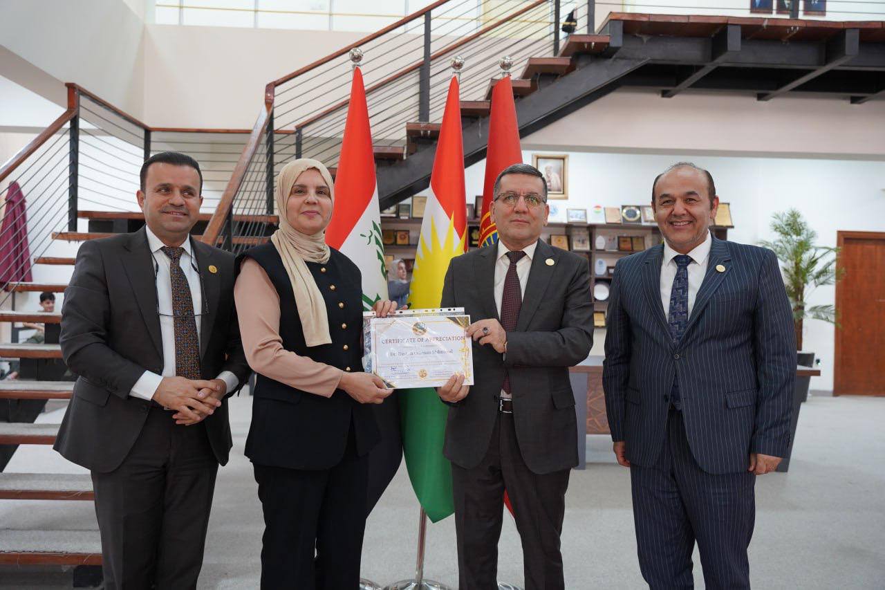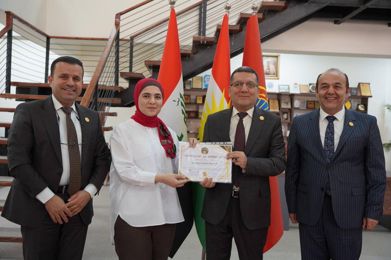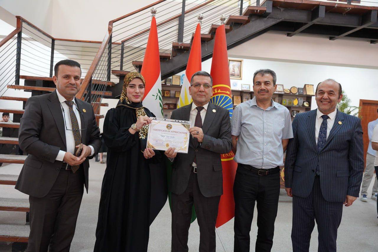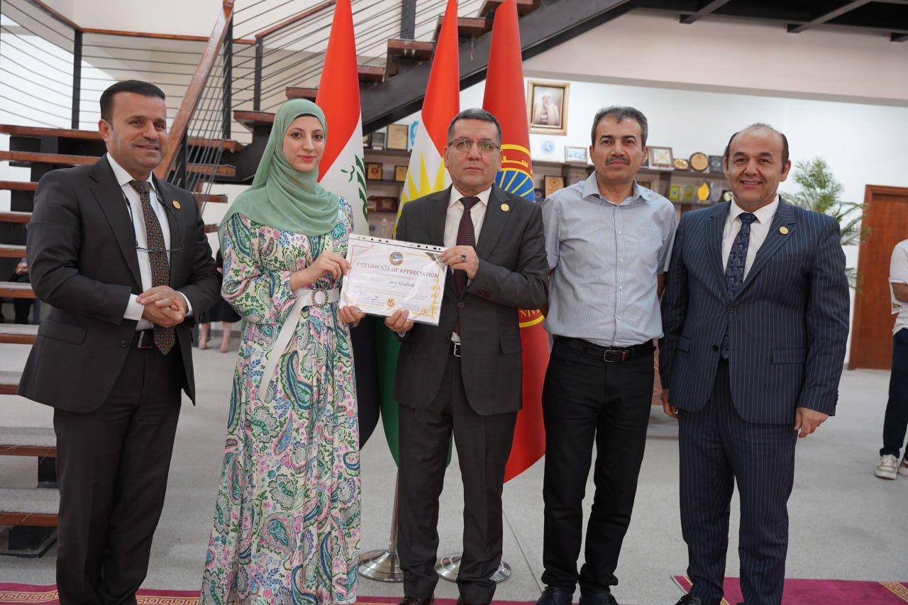 ئەمڕۆ رێككەوتی 5ی ئابی 2025 "پ.د. كامران یونس محمدامین" سەرۆكی زانكۆ، بە ئامادەبوونی "پ.د. حسین سعدی" یاریدەدەری سەرۆكی زانكۆ بۆ كاروباری كارگێڕی و دارایی و "م. حسین احمد مستەفا" بەرێوەبەری سەنتەری پەرەپێدانی كار و كارسازی، بڕوانامەی رێزلێنانی بەخشرایە مامۆستایان و قوتابییانی بەشدار لە پرۆگرامی ئاڵوگۆرى زانستى جیهانى.